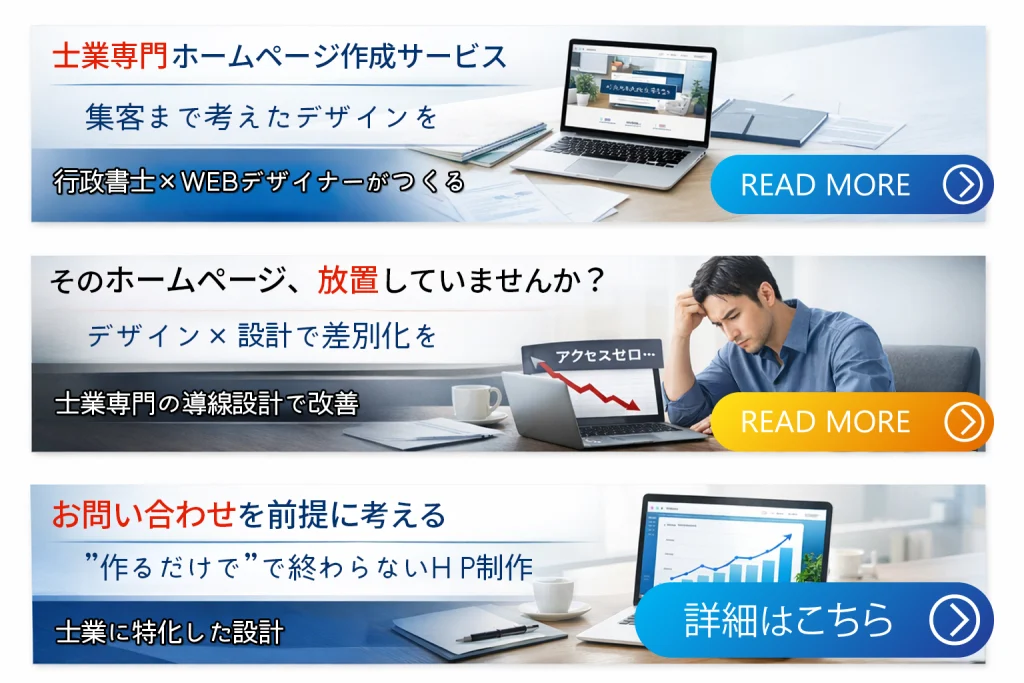 当事務所では、行政書士としての知見とWEBデザインの両方を活かし、「伝わる・信頼される・問い合わせにつながる」ホームページを制作しています。