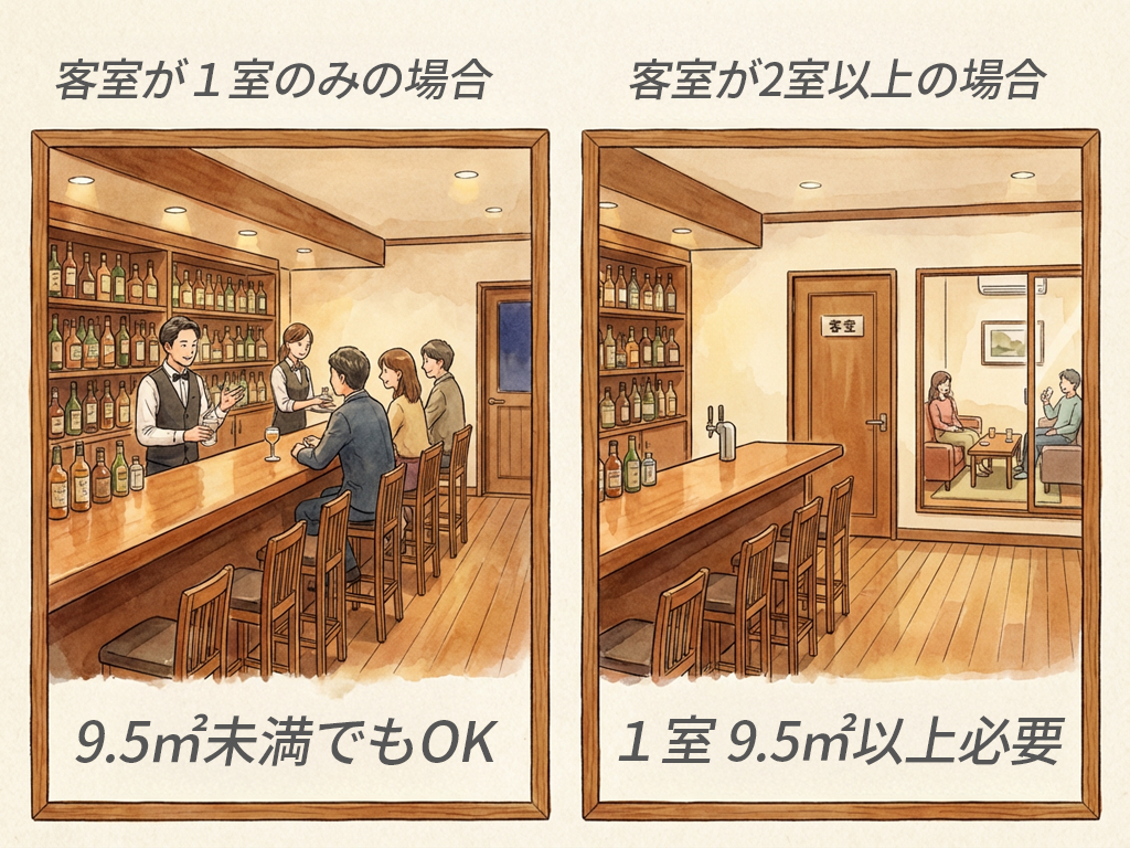 深夜酒類提供飲食店営業では、客室の1室の床面積を9.5㎡以上にしなければなりません。