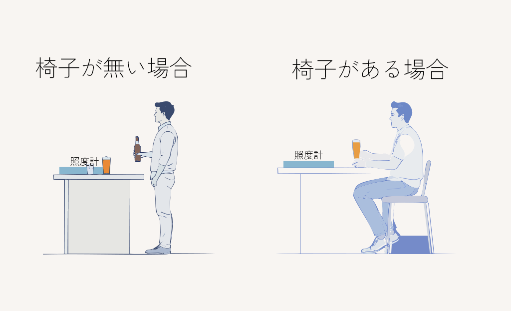 明るさを測定する位置は、「客席に食卓その他の飲食物を置く設備がある営業所については、当該設備の上面及び当該上面の高さにおける客の通常利用する部分」と定められていますので、どこで測っても良いというわけではありません。
